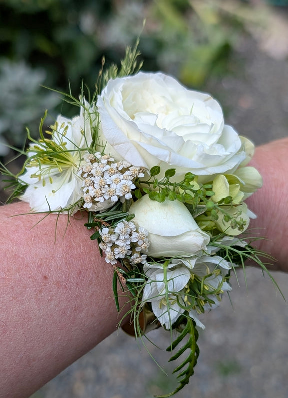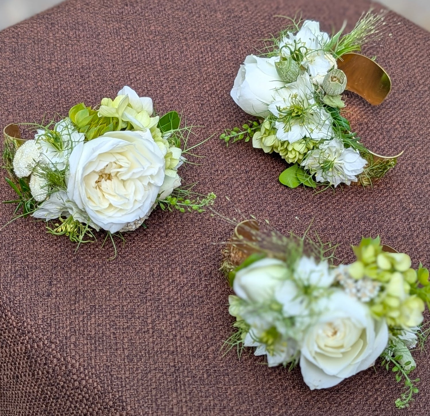 Wrist Corsages are built on an cuff that is easy to adjust to size on each person. They arrive in a cellophane pouch so they may be kept cool until your event.